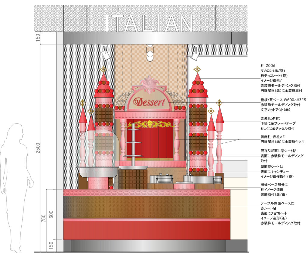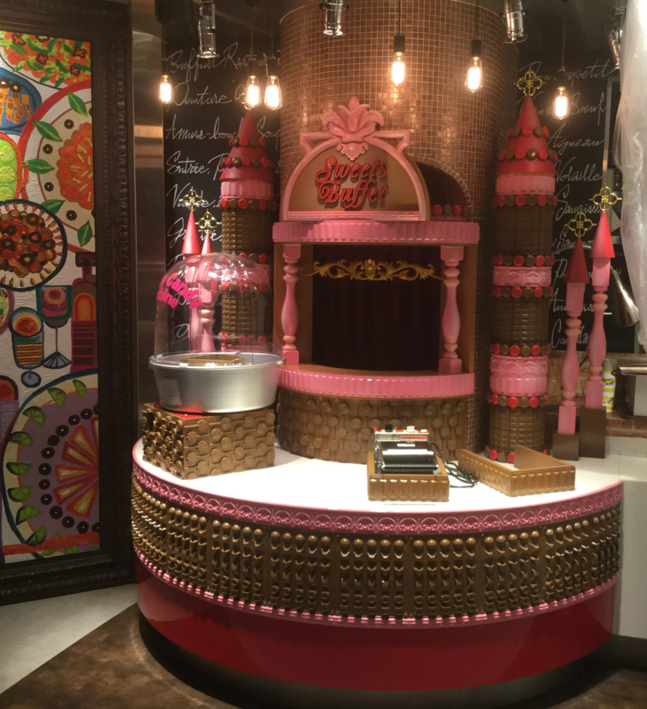 既存タイル柱の周りに新たに増設するBuffet用のお菓子コーナーの装飾を